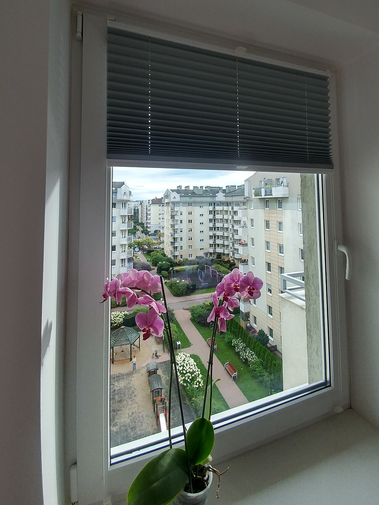 Szare rolety wewnętrzne do biura dzień noc Warszawa