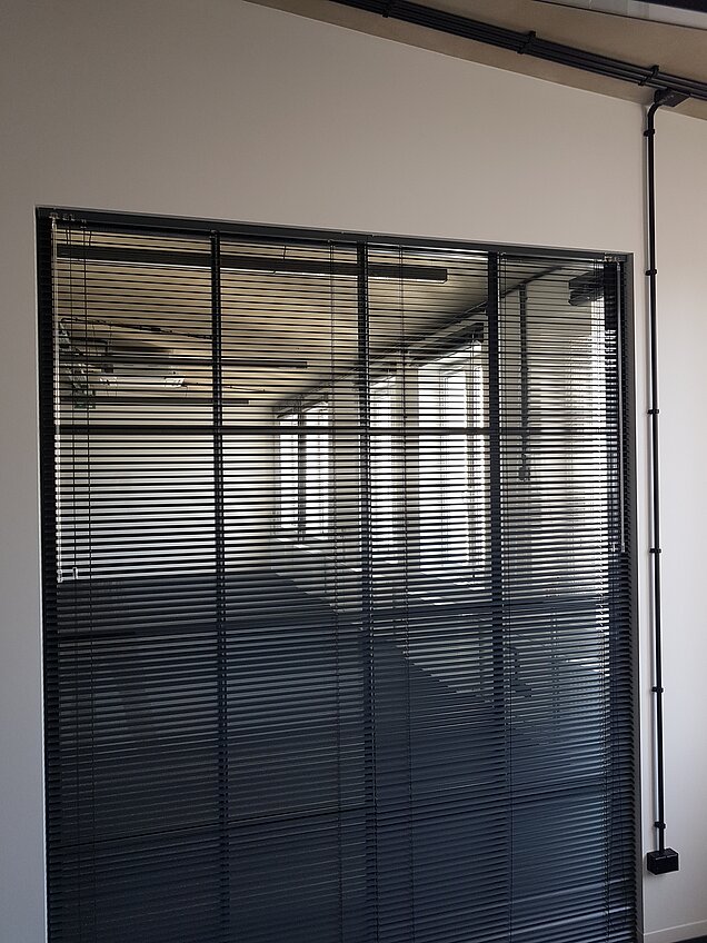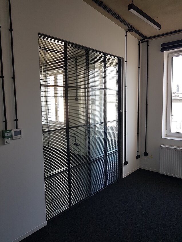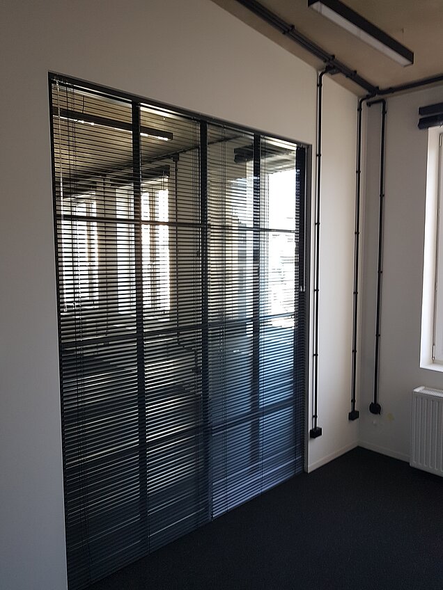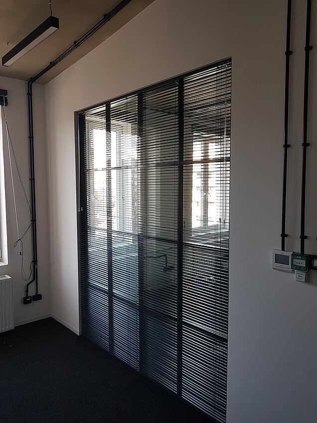 Szare rolety wewnętrzne do biura dzień noc Warszawa