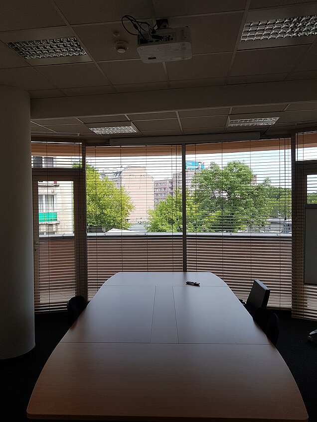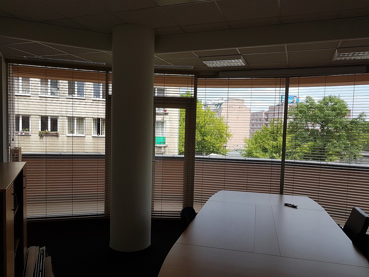 Szare rolety wewnętrzne do biura dzień noc Warszawa