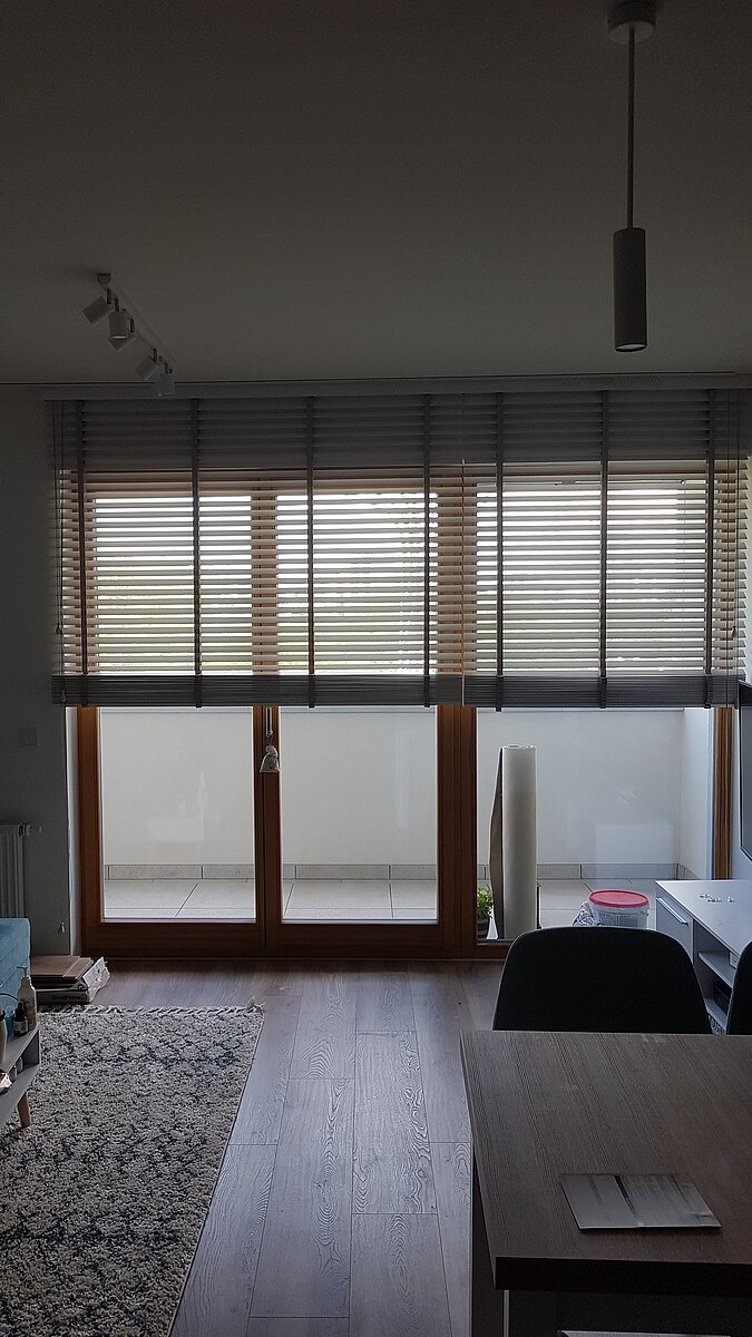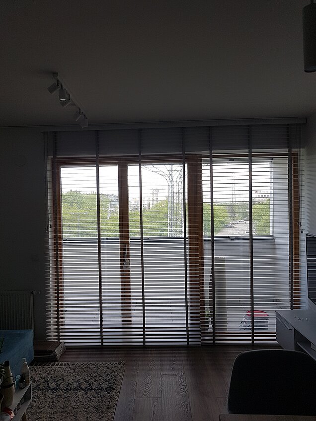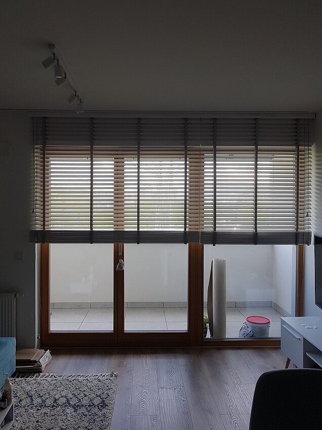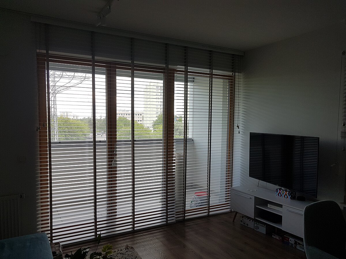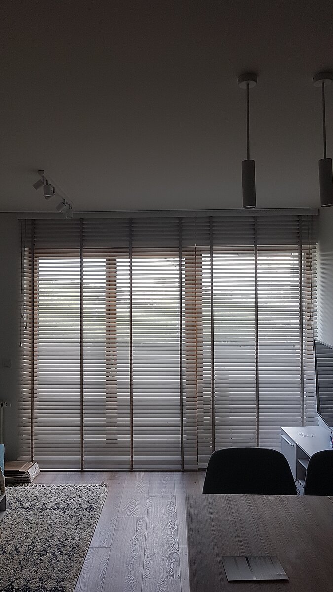 Szare rolety wewnętrzne do biura dzień noc Warszawa