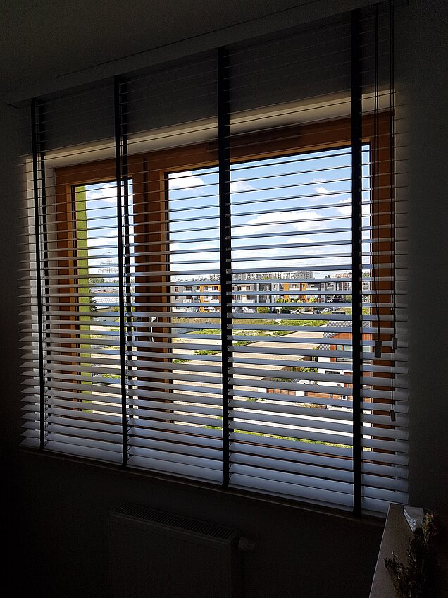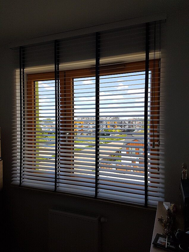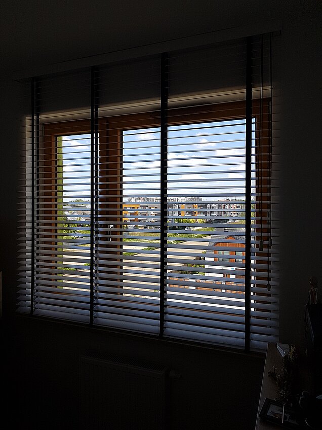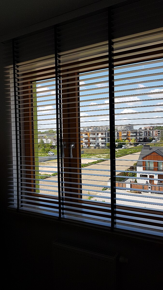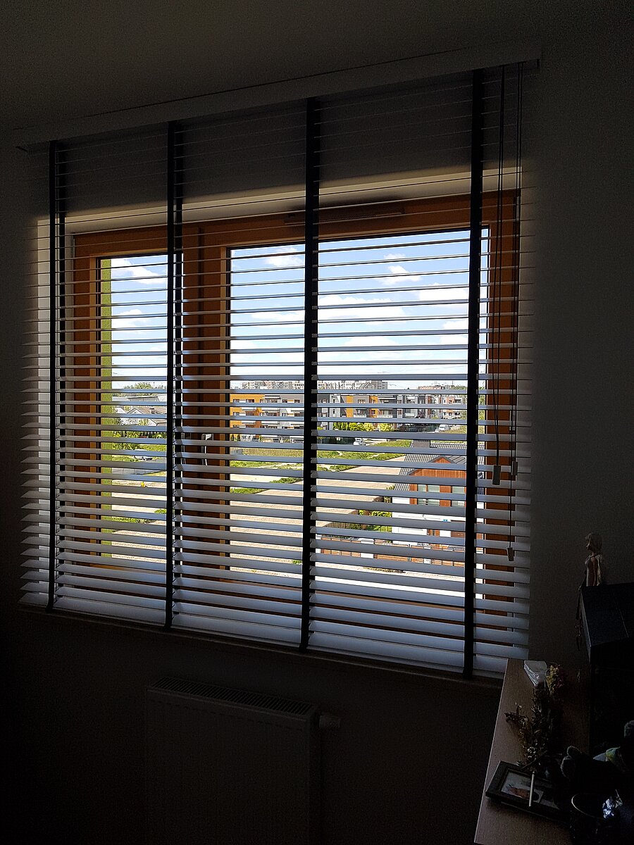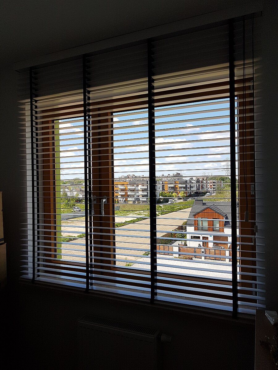 Szare rolety wewnętrzne do biura dzień noc Warszawa