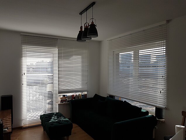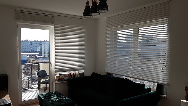 Rolety okienne w kasecie białej do nowoczesnego salonu Marki